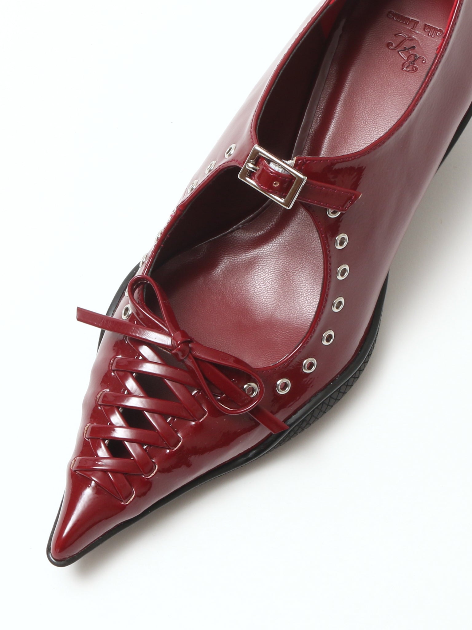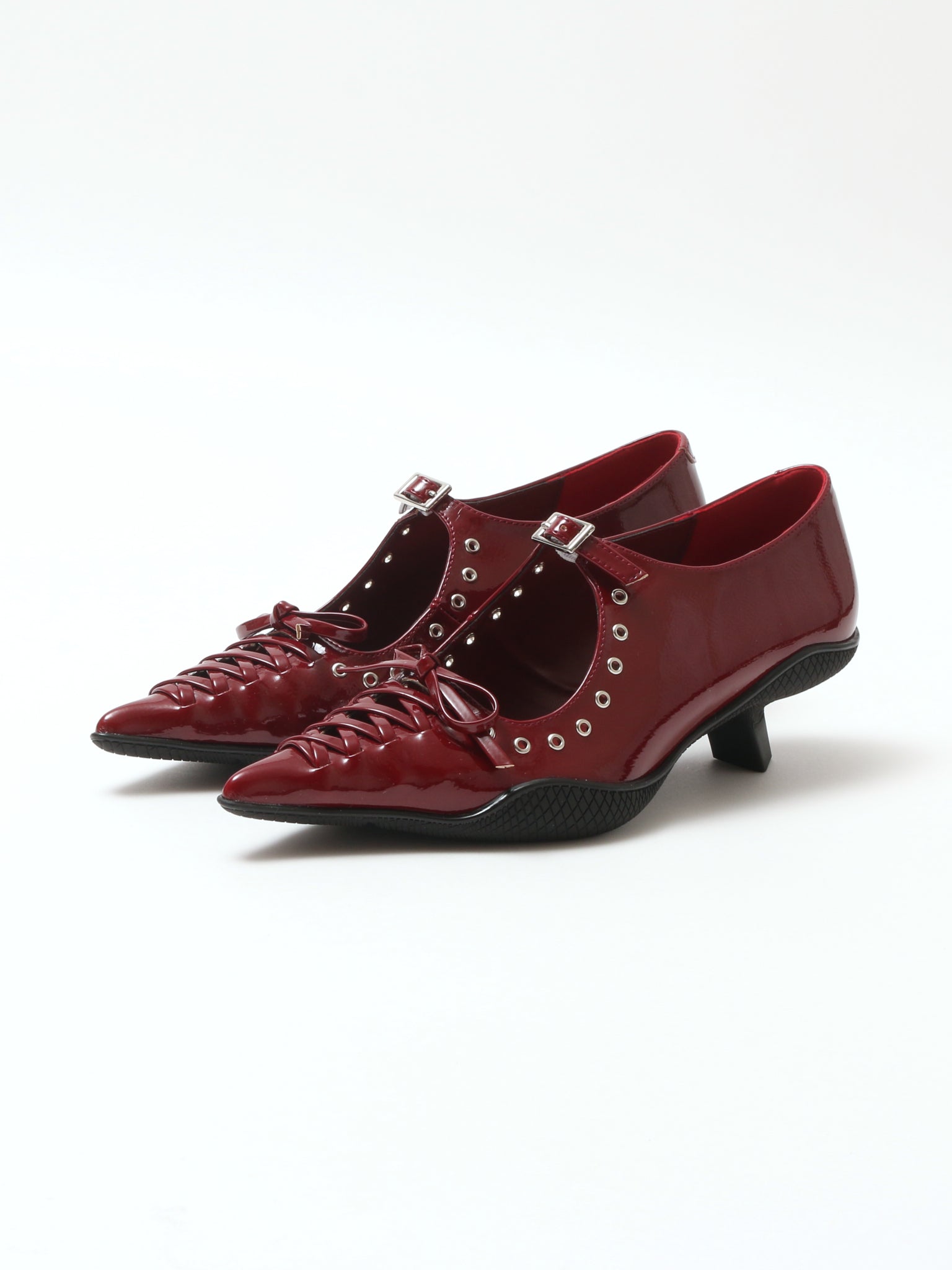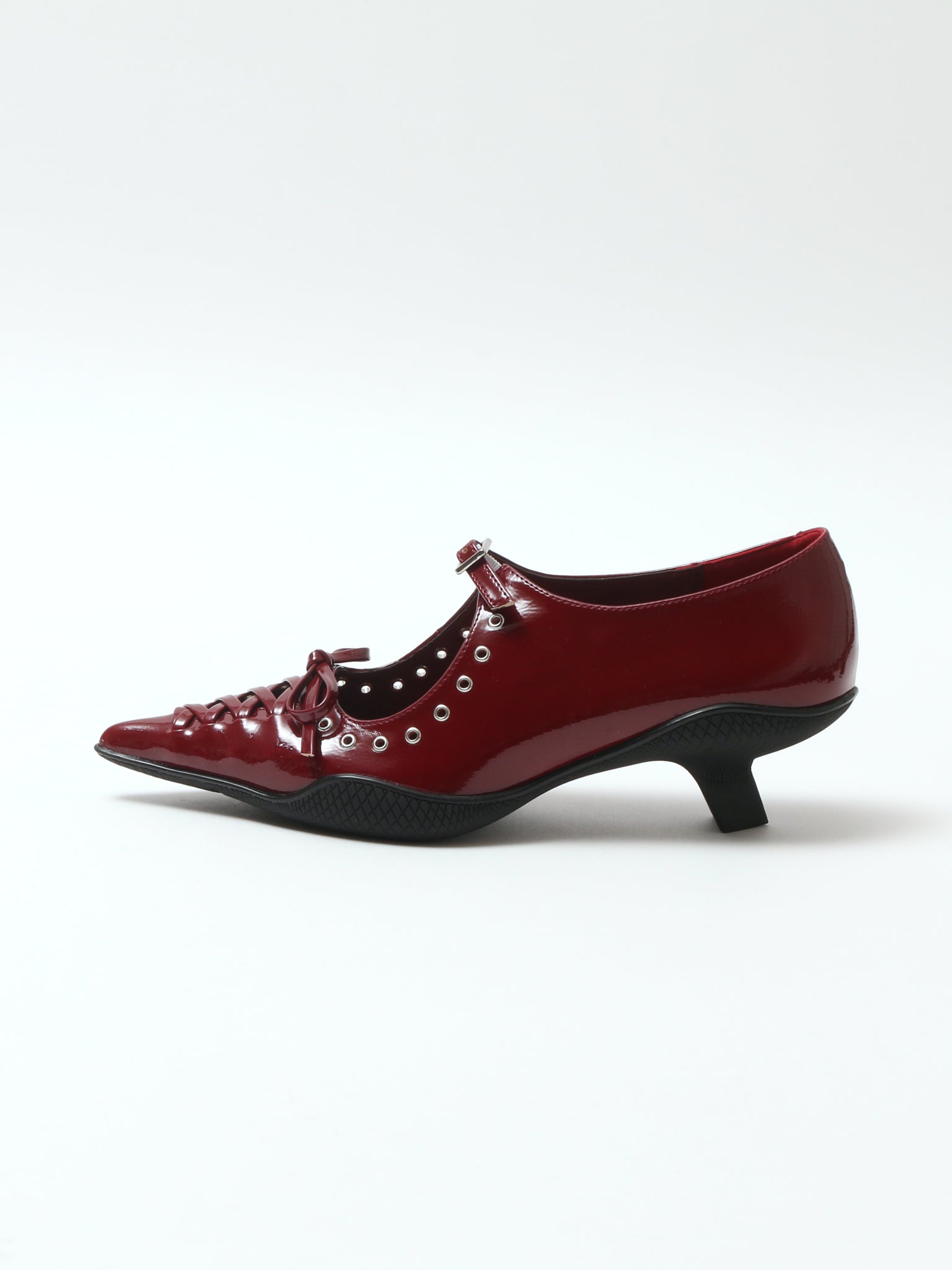 新色に深みのあるボルドーカラーをプラス。大人っぽく落ち着いた色味が特徴的です。アイレットの金具使いでさらに上品な雰囲気を醸し出しています。