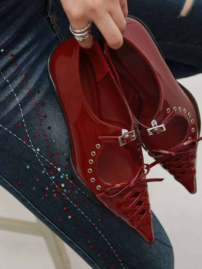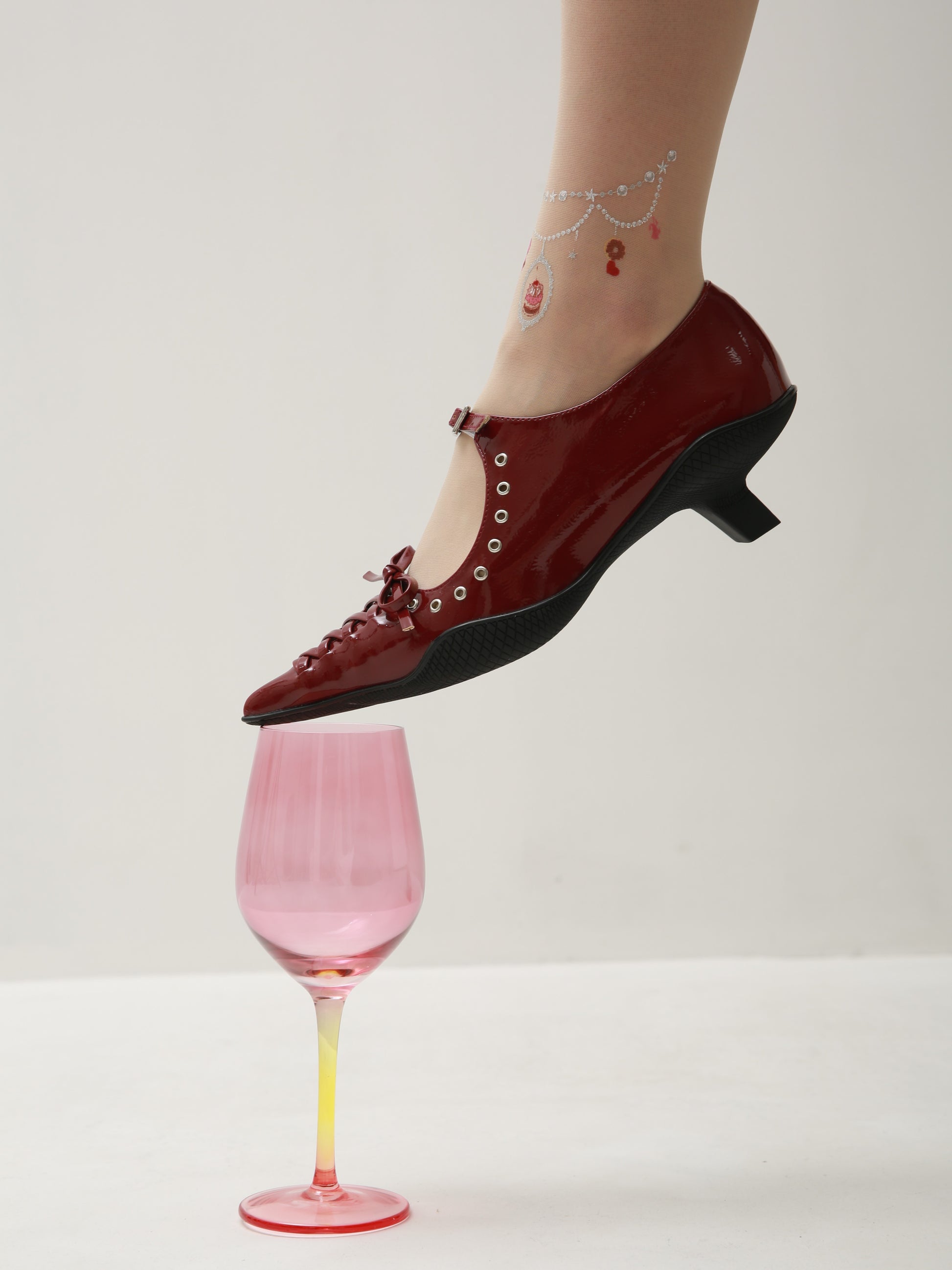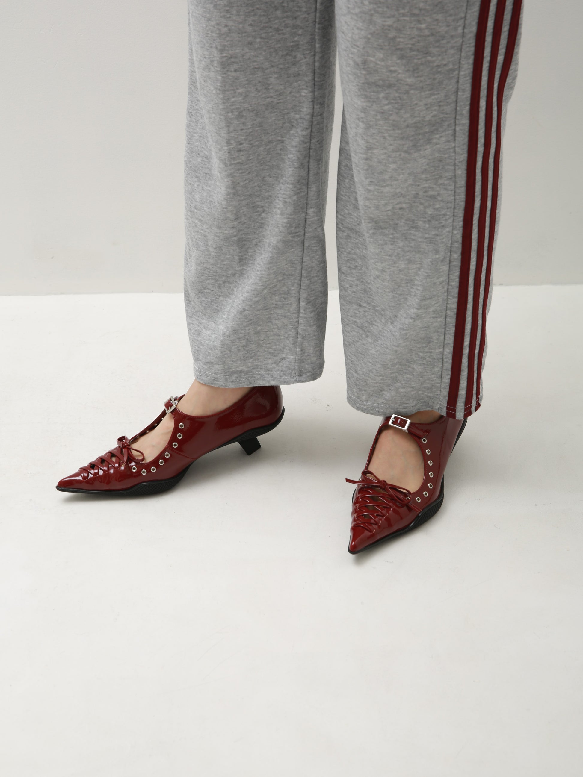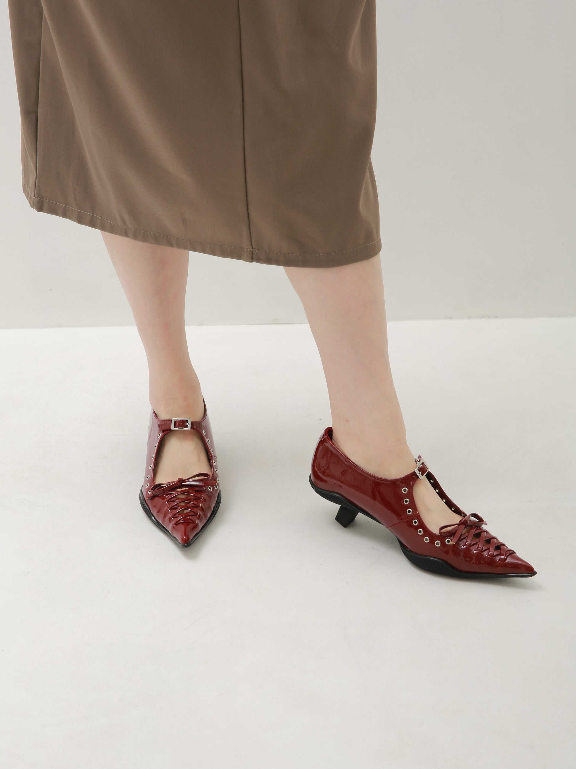 新色に深みのあるボルドーカラーをプラス。大人っぽく落ち着いた色味が特徴的です。アイレットの金具使いでさらに上品な雰囲気を醸し出しています。