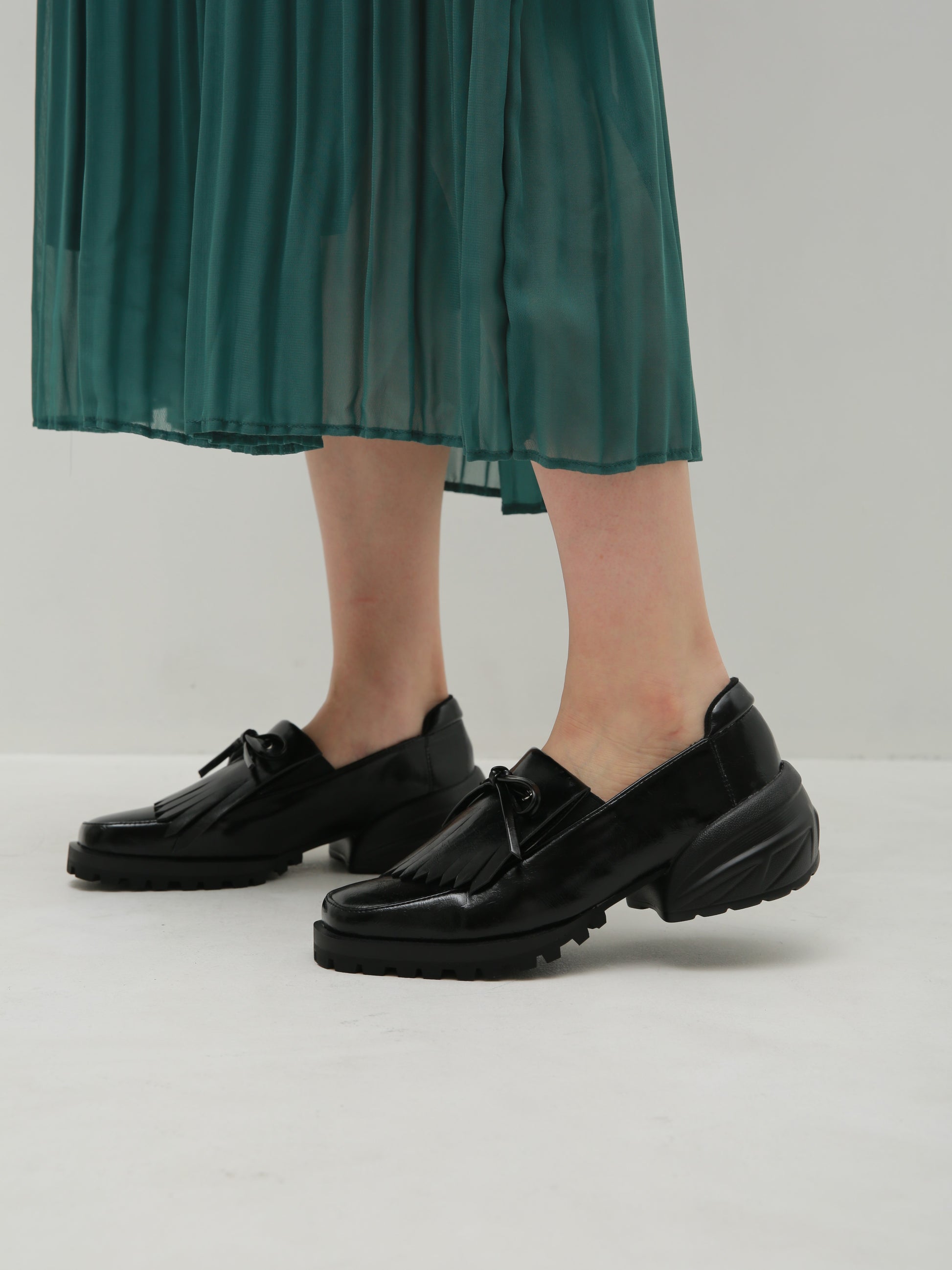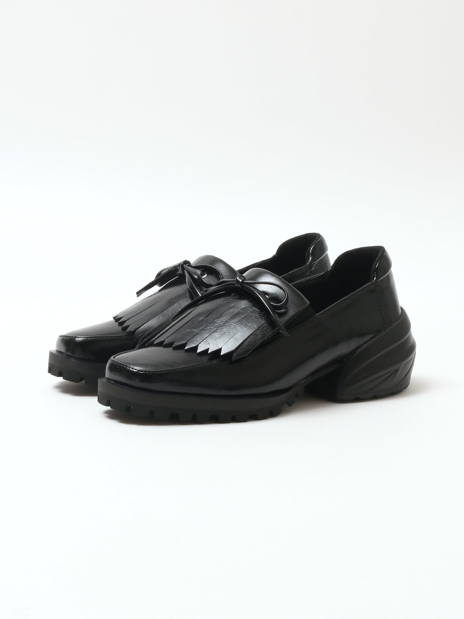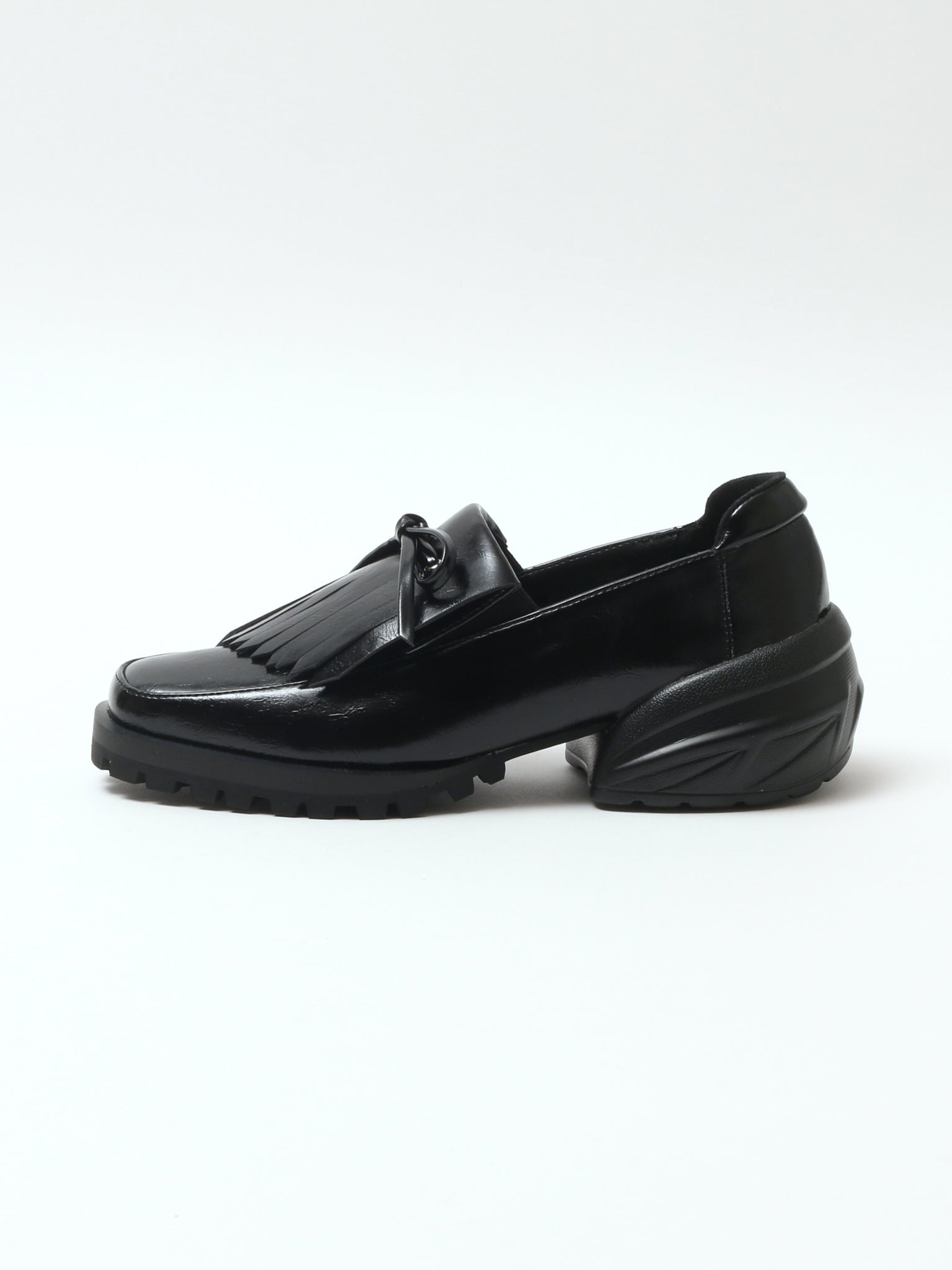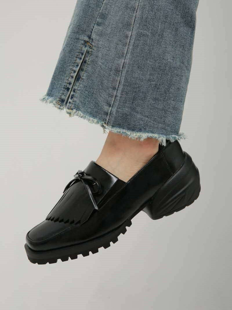 ONでもOFFでも活躍する、普段のコーディネートに馴染みやすいように、フリンジ×5cmの高さのスニーカーヒールを施し、個性的かつスタイリッシュにデザインされています。