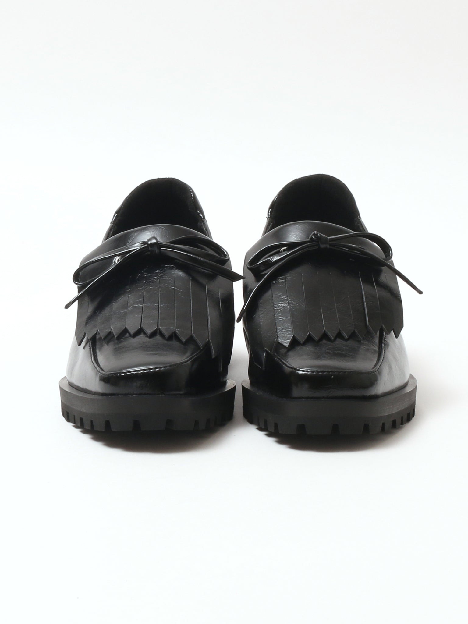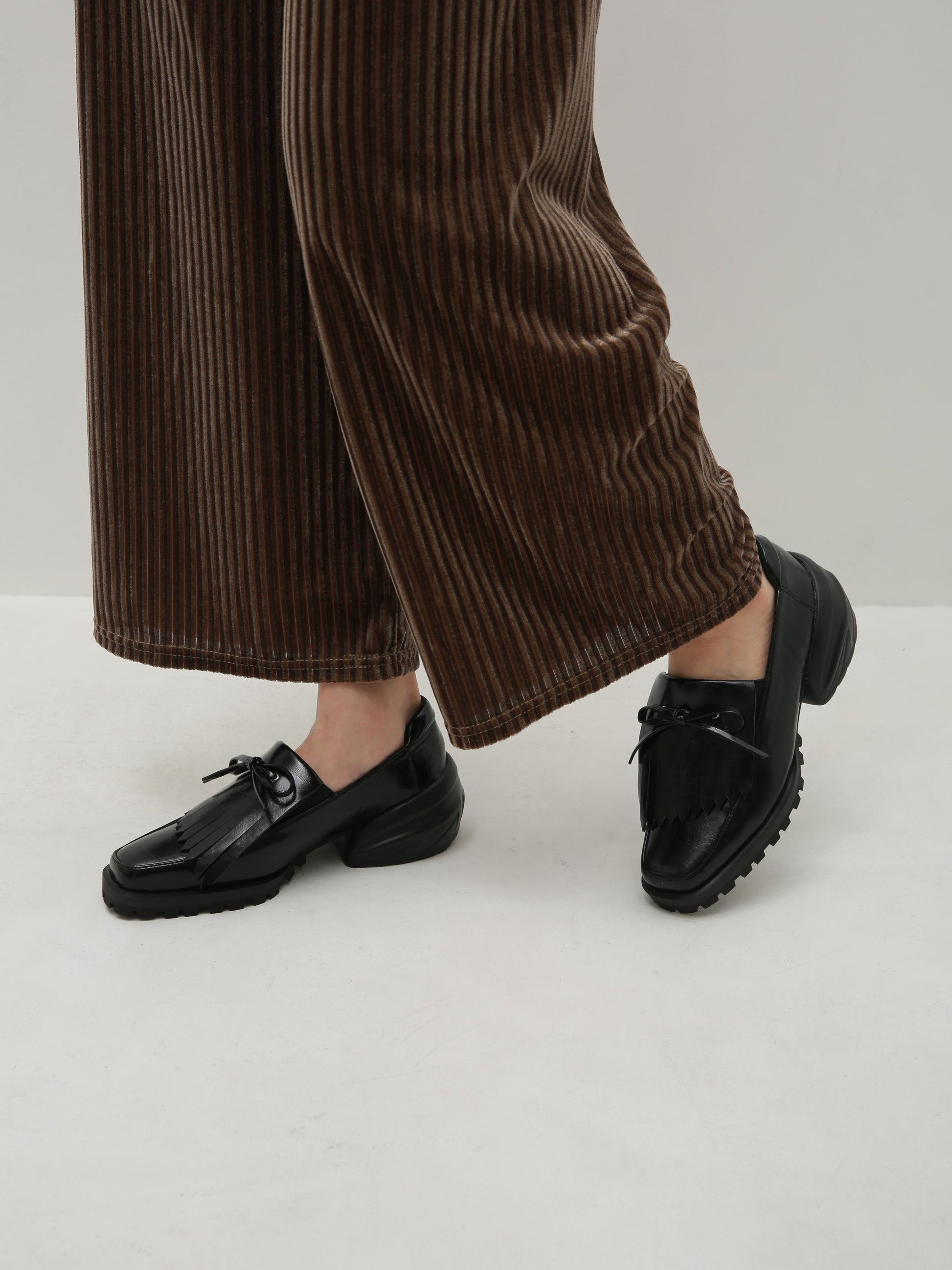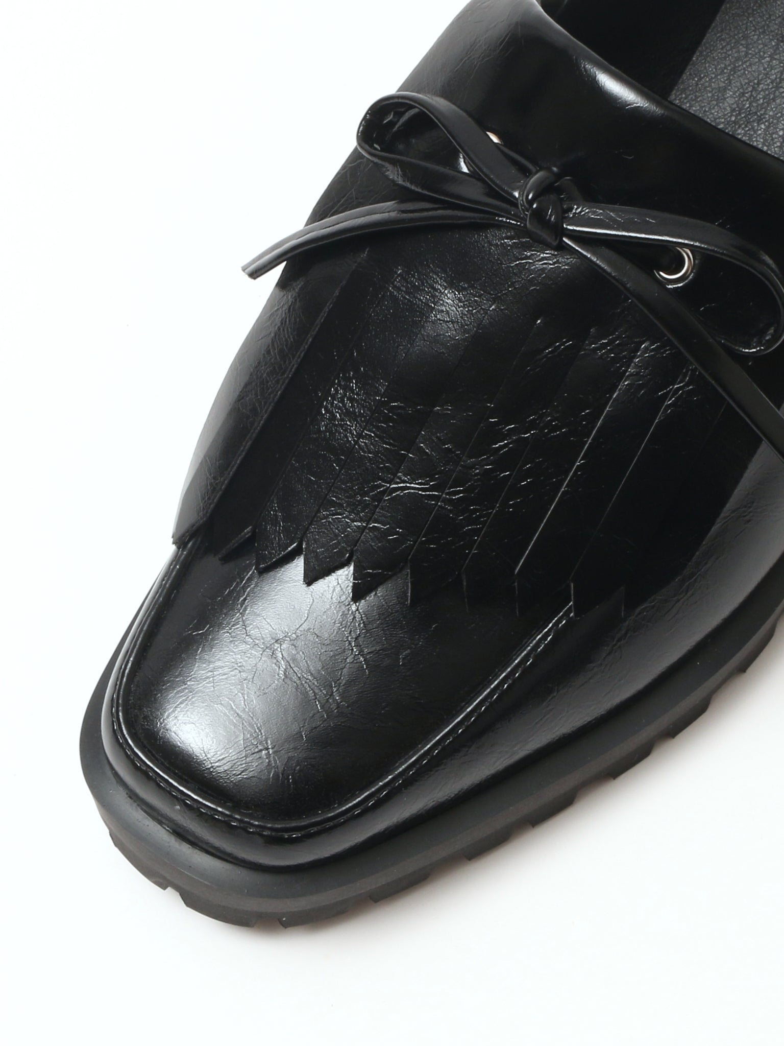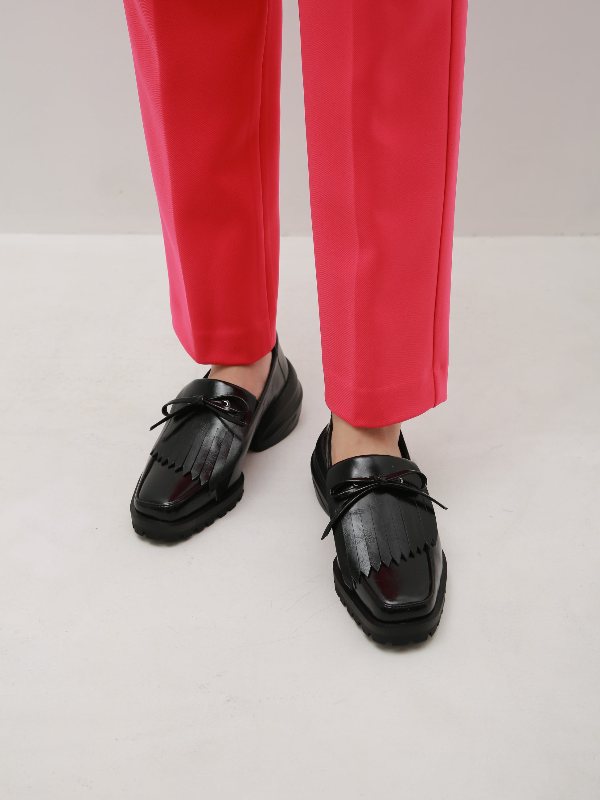 ONでもOFFでも活躍する、普段のコーディネートに馴染みやすいように、フリンジ×5cmの高さのスニーカーヒールを施し、個性的かつスタイリッシュにデザインされています。