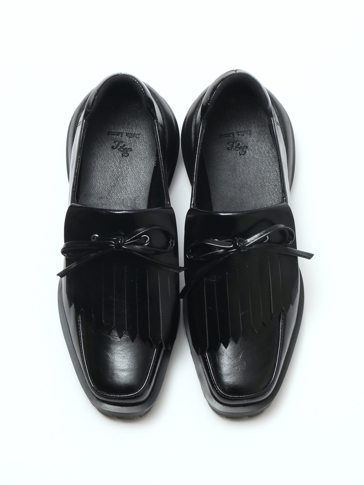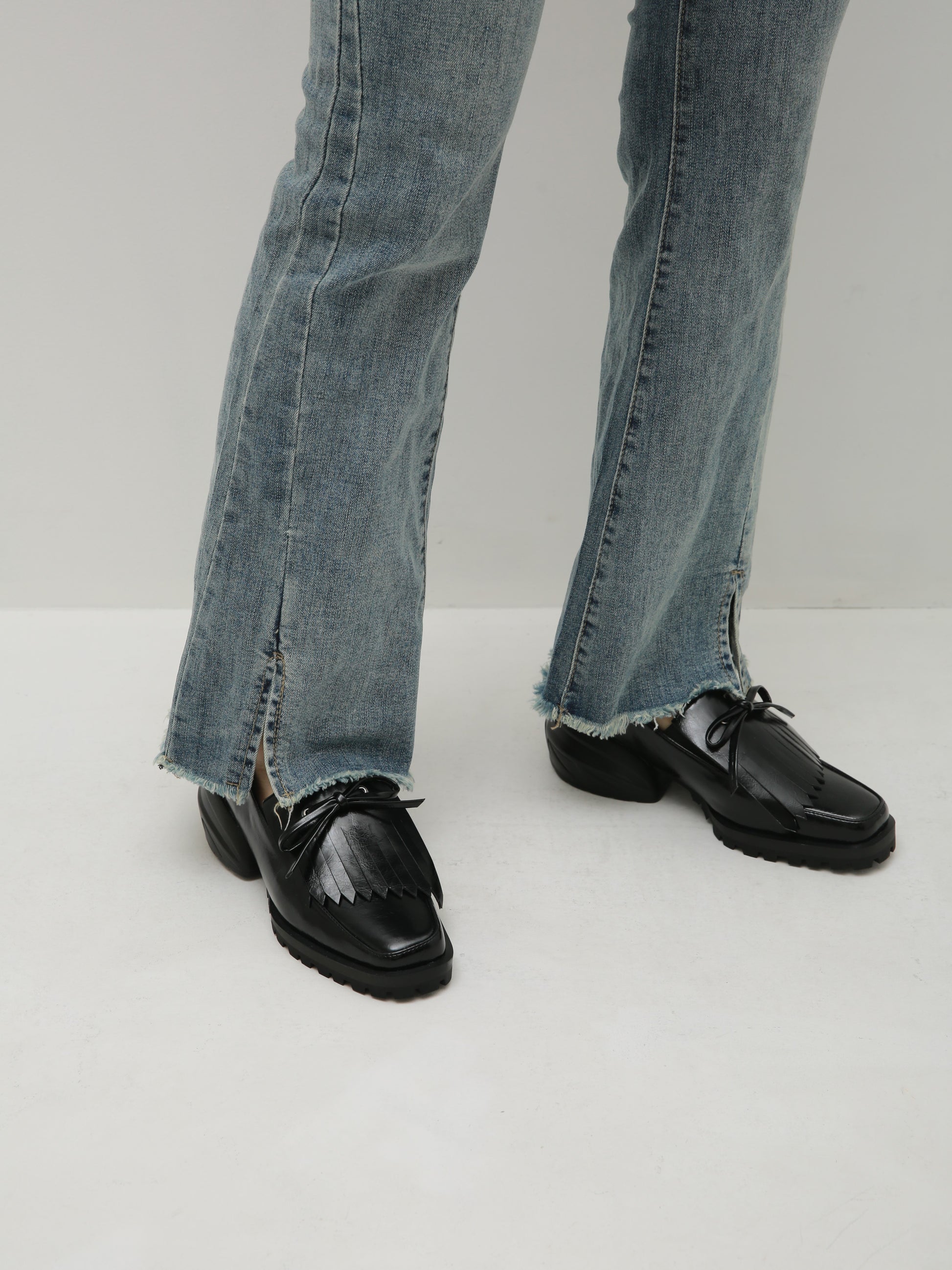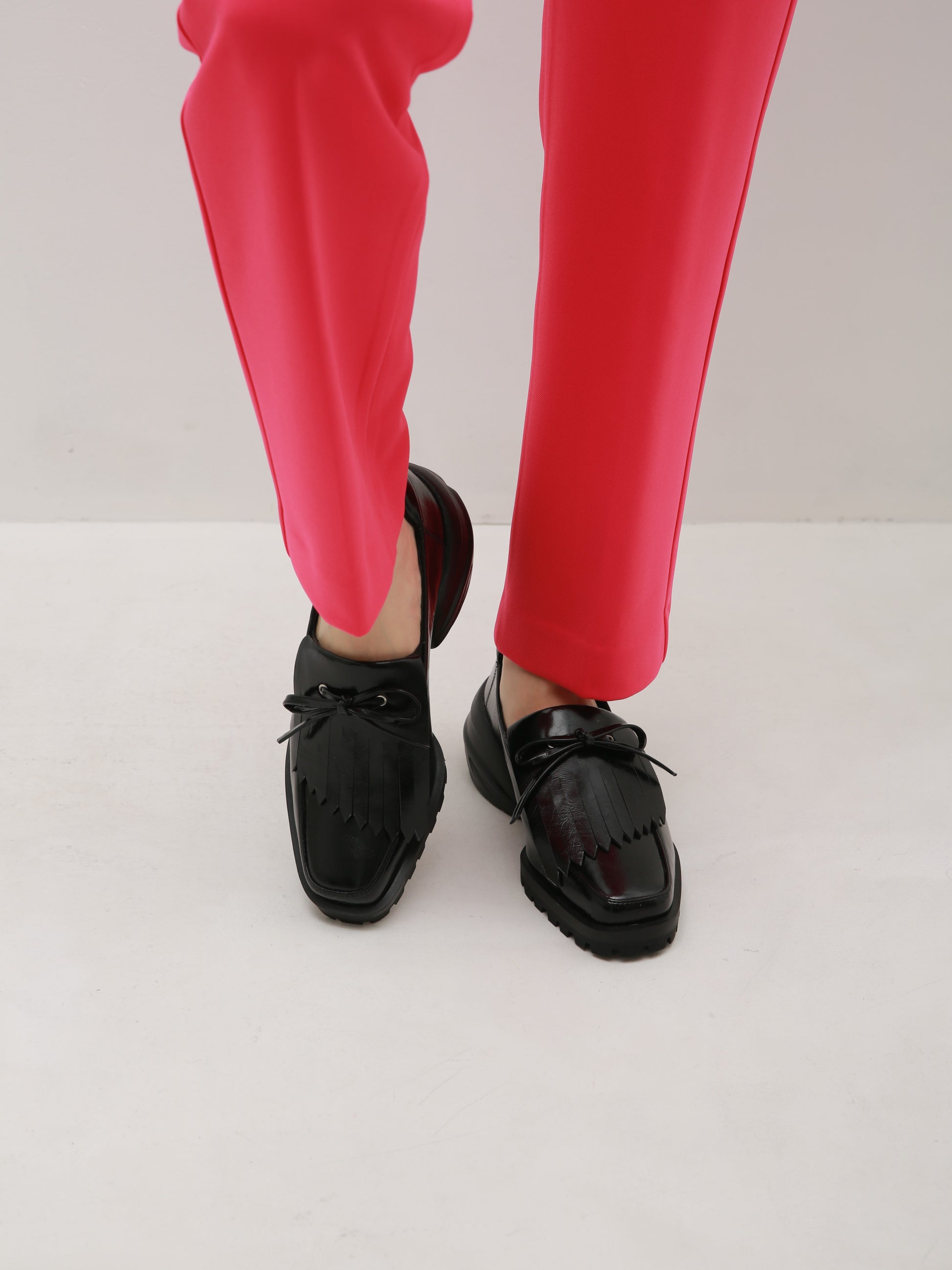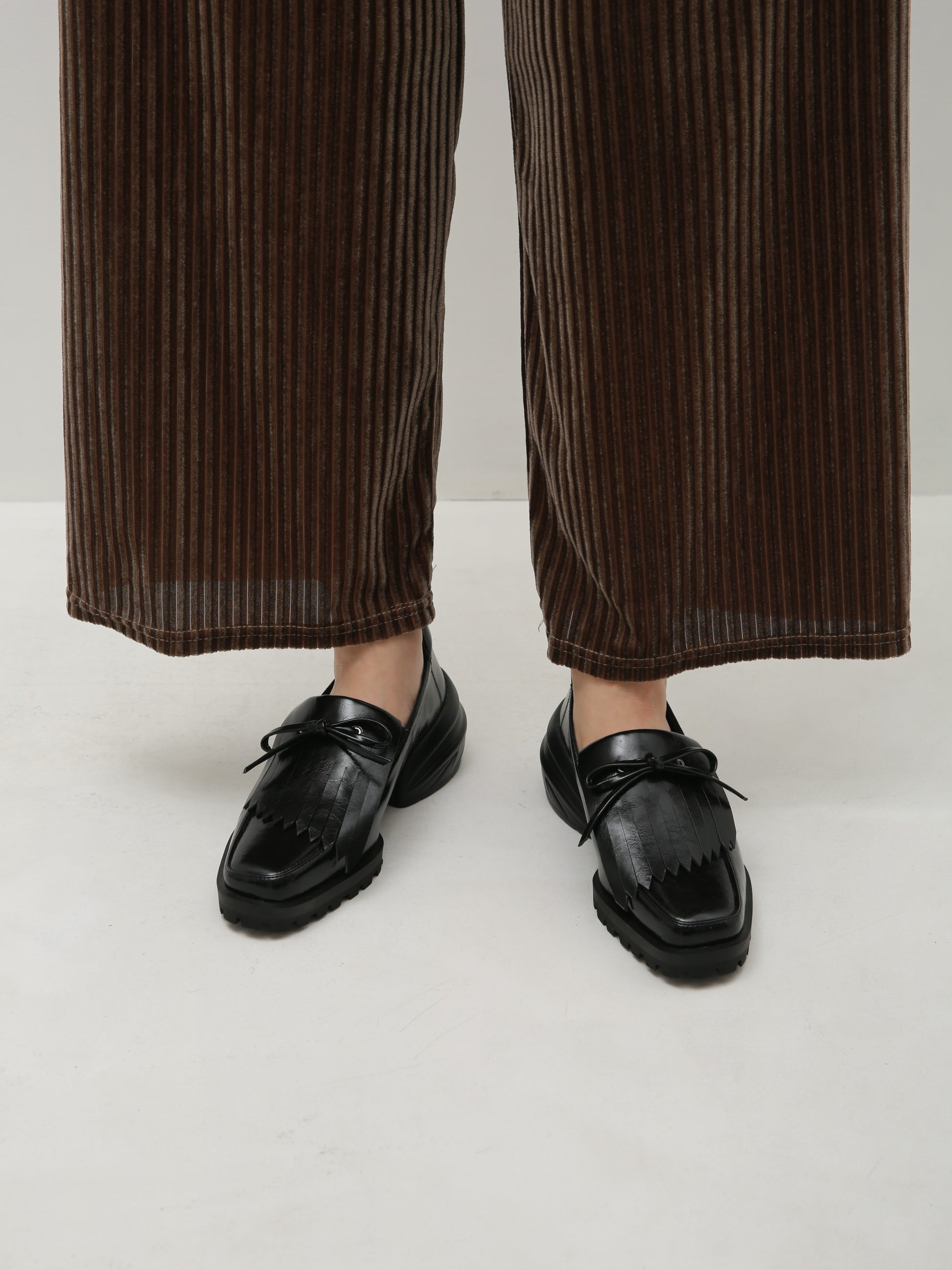 ONでもOFFでも活躍する、普段のコーディネートに馴染みやすいように、フリンジ×5cmの高さのスニーカーヒールを施し、個性的かつスタイリッシュにデザインされています。